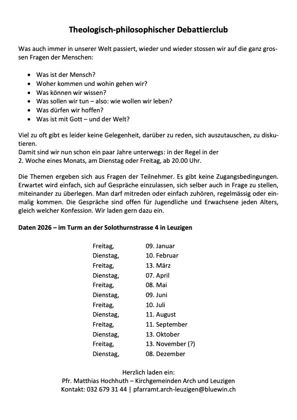 Die Themen ergeben sich aus Fragen der Teilnehmer und ist für Frauen und Männer jeden Alters, gleich welcher Konfession. Wir treffen uns im Turm an der Solothurnstrasse in Leuzigen:
